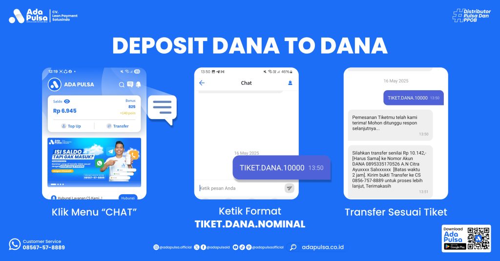 Sebelum Transfer pastikan nomor DANA beserta nominal yang di transfer sudah sesuai dg reply tiket dari centernya. Setelah transfer berhasil jangan lupa segera kirim bukti TF ke CS ADA PULSA di nomor : 0856-757-8889 untuk proses lebih lanjut. Pengisian saldo via DANA KE DANA open pukul 06.00-22.00 WIB.
