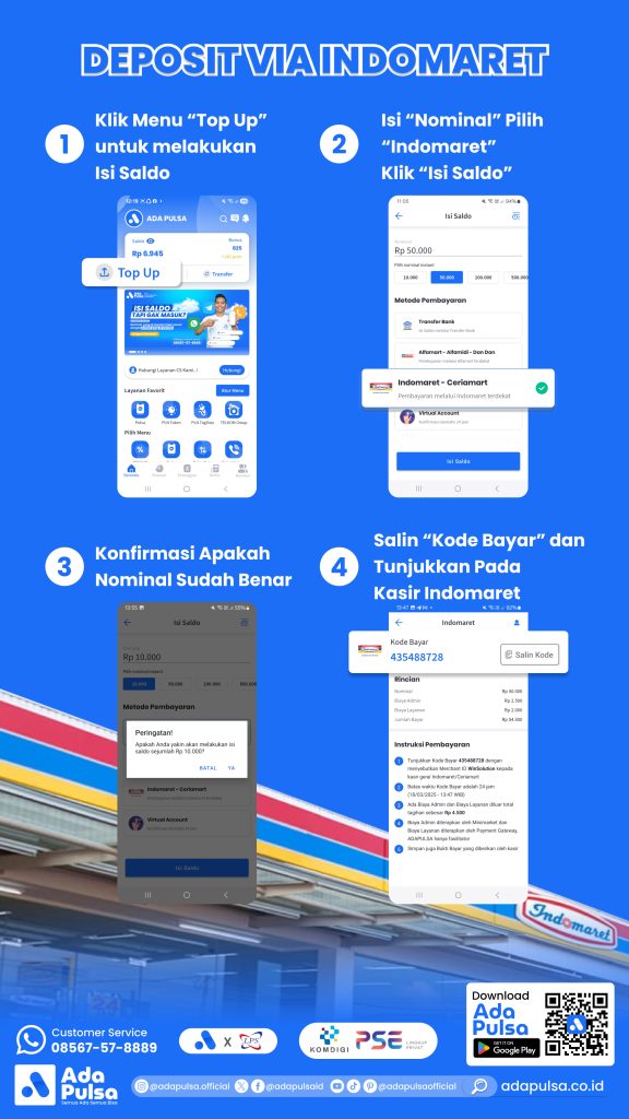 3. Biaya admin di tetapkan oleh minimarket dan biaya layanan di tetapkan oleh payment gateway ( Ada Pulsa hanya fasilitator ).