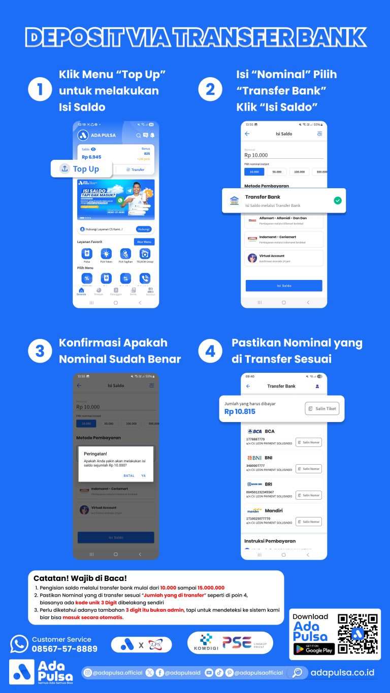Sebelum Transfer pastikan sudah cek intruksi pembayaran, dan pastikan nomor rekening beserta nominal yang di transfer sudah sesuai dg reply tiket yang tertera di App ADA PULSA. Mohon untuk tidak transfer di saat bank GANGGUAN dan Jika dalam kurun waktu 15 menit saldo belum masuk segera Hub. CS 0856-757-8889.
