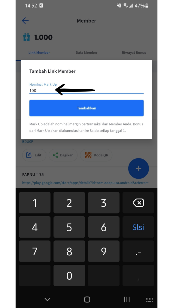 4. Tentukan MarkUp atau selisih harga (bisa di isi mulai nominal 25 s/d 500).